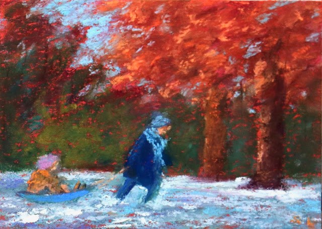 This painting is based on a photo from a friend of mine of a local Atlanta park after our snowfall last week. Since we don’t see snow all that often in the south, we tend to go a little crazy when we do. The good part of the craziness is that so many workplaces close, that parents can actually have as much fun playing in the snow as their kids can.