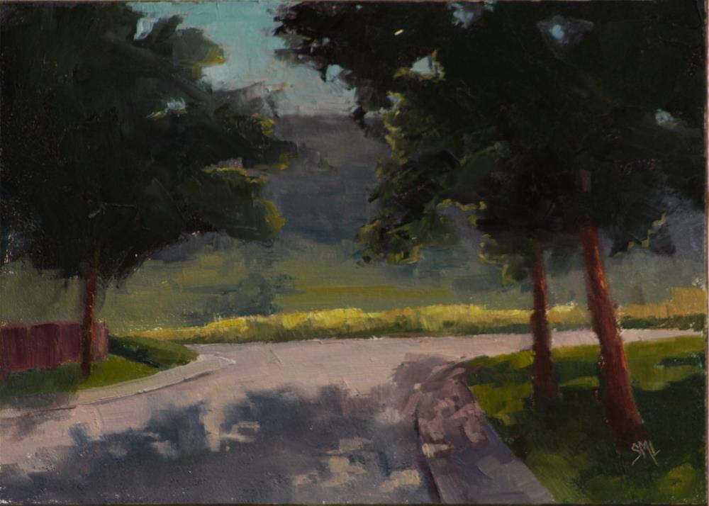 I had originally planned a theme around my daily walks with my pup, Violet. A painting each day. A couple of weeks ago Violet started limping. She was diagnosed with Elbow Dysplasia. She had surgery today and will require 4-6 weeks of recuperation. So... paintings will be from walks prior to her surgery. Her bouncy, wiggly bum and endless energy will still be in each and every one of the paintings.