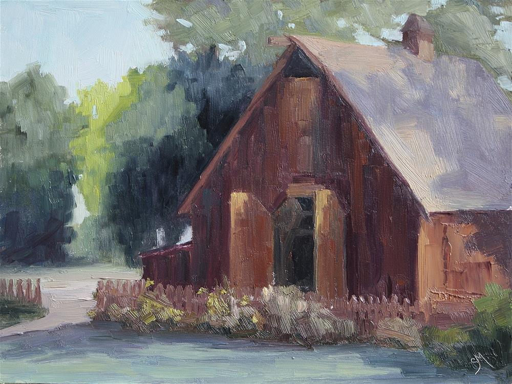 #20 of 30 Paintings in 30 Days. this scene drew me in with the shadows cast across the trees, shadows in the barn and tree shadows cast across the roof of the barn and the grass.