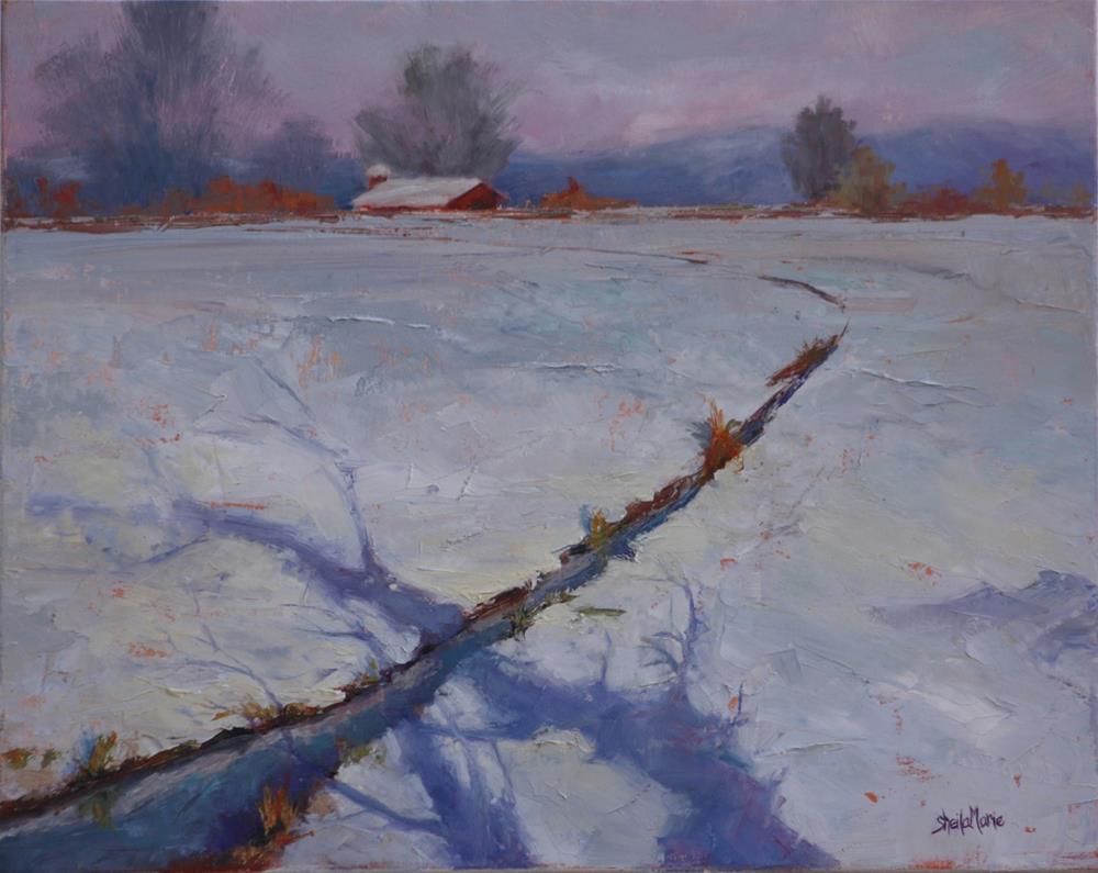 This is an enlarged version of "Up Bobolink Trail". I redesigned, adding a creek and tree shadows entering the scene. This brought more cool blues and violets to work with the warm oranges and pinks in the scene.