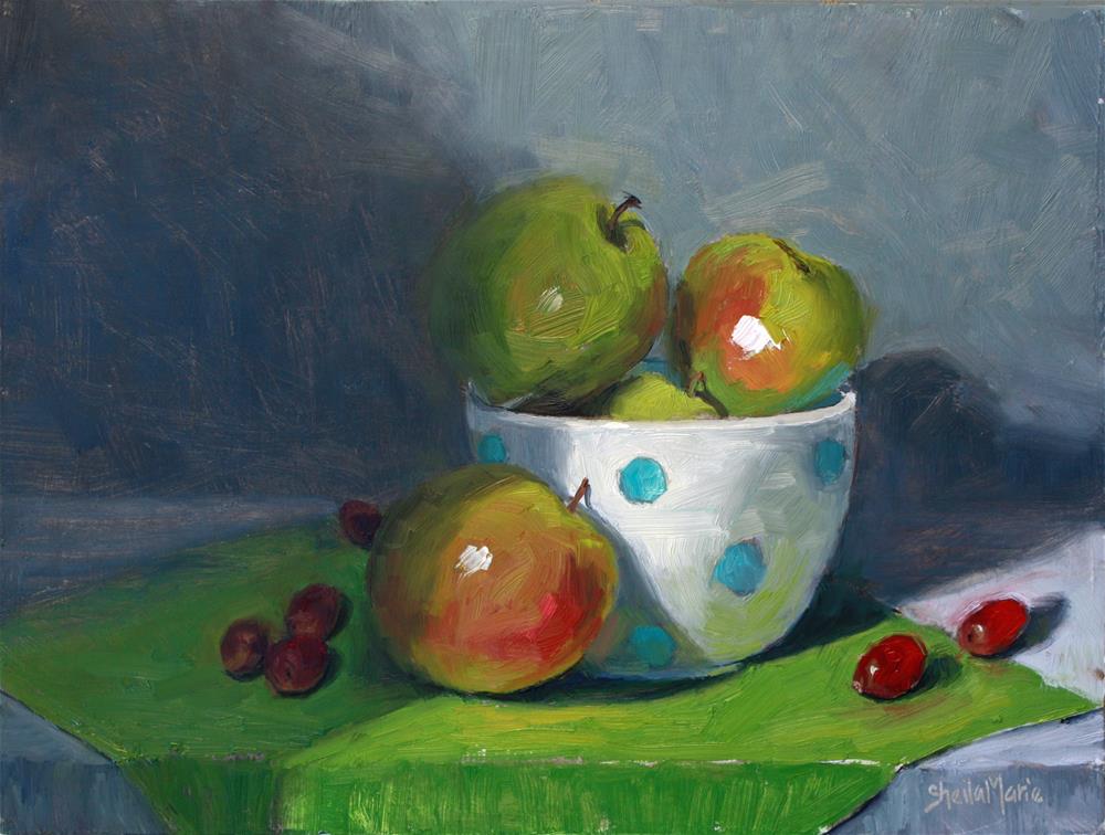 Bowl of Grannies has been unavailable as it was tied up in two different shows. I love working with apples. Hopefully, I'll be able take advantage of my daughter's apple tree. I've brought home apples twice and then get too busy to get a still life set up designed. After just one day the poor leaves are pretty wilted. I've go a lot going on in the next week or two, hopefully the apples will hang in just a bit longer. Cross fingers Bowl of Grannies has been unavailable as it was tied up in two different shows. I love working with apples. Hopefully, I'll be able take advantage of my daughter's apple tree. I've brought home apples twice and then get too busy to get a still life set up designed. After just one day the poor leaves are pretty wilted. I've go a lot going on in the next week or two, hopefully the apples will hang in just a bit longer. Cross fingers |