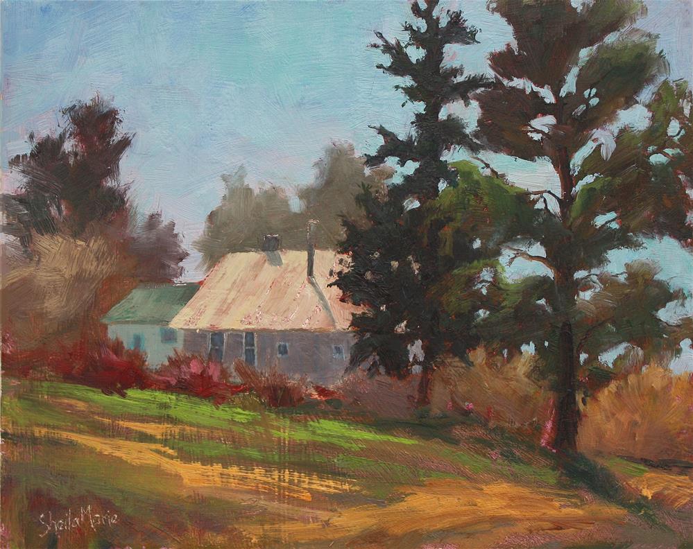 Looking for a spot to pull over and paint this house caught my eye. I loved the light pouring over the roof while the upright back of the house was in shade. Those big trees on the right and spring grass starting to fill in the ground around the long yellow grasses flattened over the winter.