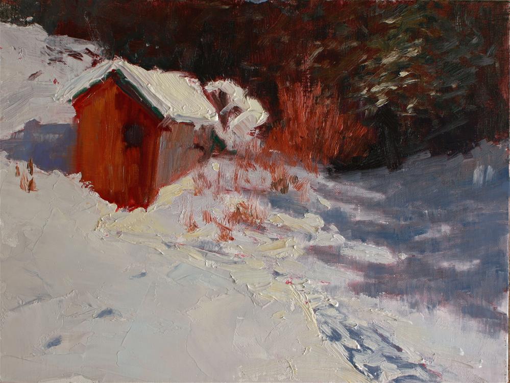 Even though the temp was only around 28 degrees there was no wind and abundant sun. A fantastic day to paint in the snow. This was a little cabin next to an old mine just outside of Breckenridge, CO