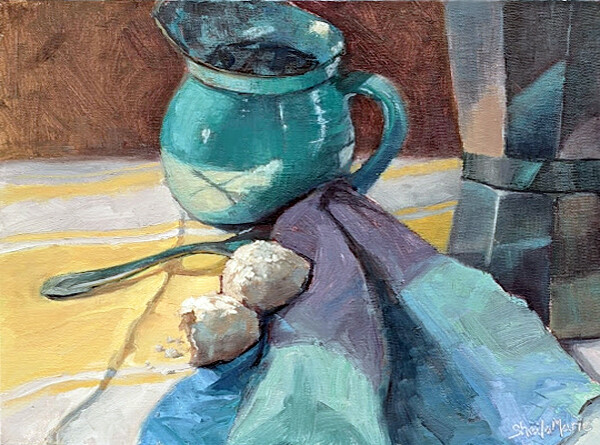 Last week's Fling the Paint still life setup proved to be a challenge for all of us. I started with the intent to include all the items set in front of us. That espresso pot and that spoon was drawn several times. After an hr or more I changed my position, where I stood. This time it worked out pretty well. I wasn't able to finish while there and thought I had a photo from the angle I was painting from. Turns out I didn't have a photo from that new view. I did have all the color notes down. I set up at home later that day and worked as best I could from memory. I do like moving in close to these setups and designing a painting from a different perspective rather than just the traditional straight on view. @sheilamarieart Last week's Fling the Paint still life setup proved to be a challenge for all of us. I started with the intent to include all the items set in front of us. That espresso pot and that spoon was drawn several times. After an hr or more I changed my position, where I stood. This time it worked out pretty well. I wasn't able to finish while there and thought I had a photo from the angle I was painting from. Turns out I didn't have a photo from that new view. I did have all the color notes down. I set up at home later that day and worked as best I could from memory. I do like moving in close to these setups and designing a painting from a different perspective rather than just the traditional straight on view. @sheilamarieart |