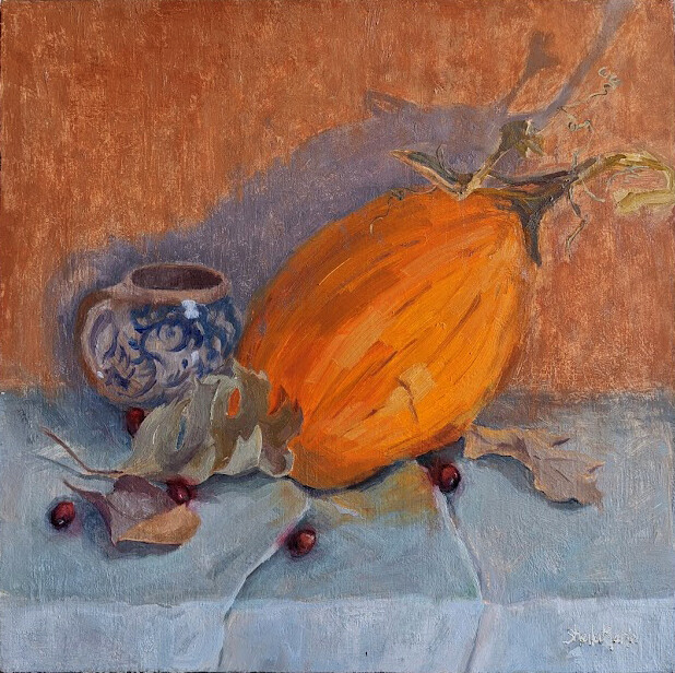 I found this beautiful little pumpkin squash along the fence line in an open space I walk frequently with Violet. I'm guessing it escaped under the fence of someone's garden. I brought it home and it's been sitting on my counter for a month waiting for me to paint it. I tried a different lighting setup. Rather than lighting from the side or above I set the light below the setup and slightly off center. It cast a hard shadow behind the squash and the cup. Photographing this painting was a bear. It's still not correct. The cloth appears more green when it actually leans a bit to the blue side. The front face of the table (cloth) is lighter, more lit in reality. @sheilamarieart I found this beautiful little pumpkin squash along the fence line in an open space I walk frequently with Violet. I'm guessing it escaped under the fence of someone's garden. I brought it home and it's been sitting on my counter for a month waiting for me to paint it. I tried a different lighting setup. Rather than lighting from the side or above I set the light below the setup and slightly off center. It cast a hard shadow behind the squash and the cup. Photographing this painting was a bear. It's still not correct. The cloth appears more green when it actually leans a bit to the blue side. The front face of the table (cloth) is lighter, more lit in reality. @sheilamarieart |