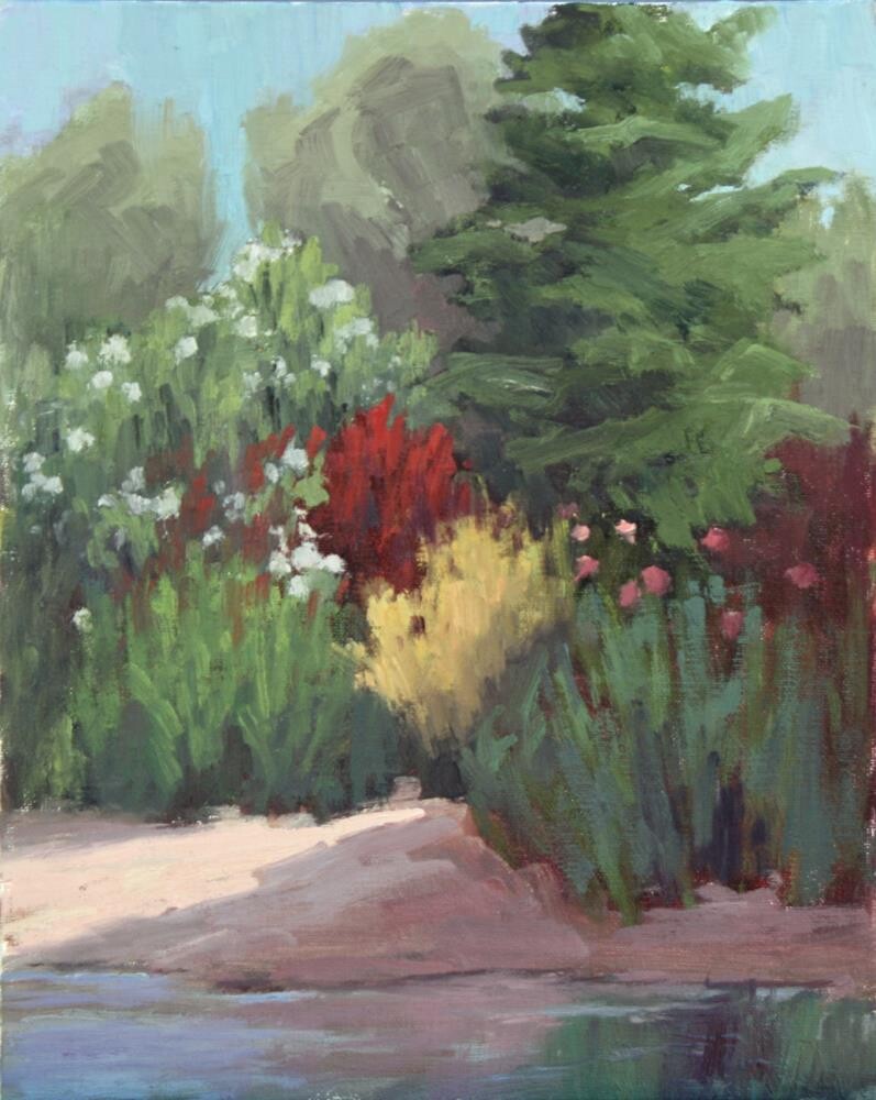 Hah, found this work in the back of my car. A few weeks ago I painted with FTP at Hudson Gardens. We settled on this spot. I was happy with that light streaking across. I wanted to work those shadows and see if I could make the light pop. In reality this area is very manicured. There's a rock wall that spans the edge of the pond. I'm not to thrilled with manicured gardens. I know, lots of work and they can be beautiful but I lean to the wild side, lol I removed that wall and mussed up the flowers designing something that I felt was much more pleasing to me. @sheilamarieart