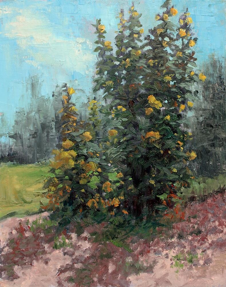 Holly started popping up in my yard several years ago. A very invasive plant. Beautiful in the spring with its yellow blossoms and then deep red berries in the fall. The leaves are wicked and thorny. Harder than heck to trim and/or cut these guys out. I started working this morning thinking that standing over by the fence I'd be shielded from the wind. It didn't work. Darn wind was all over the place. I shut it down and worked on spring cleanup of my front yard for several hrs. After noon it all quieted down. I setup once again and was at least able to use the beginning of the block-in started in the morning. The shadows had moved quite a bit, maybe 90 degrees. You can see in the setup photo I simplified around the holly and in the end did not include the fence or the neighbors house. I find that more and more once I get things started I seem to rely on the scene for correct value relationships. Other than that many times I just kind of paint intuitively and the picture starts appearing. Some painters can envision the completed painting right from the start. I don't seem to be able to do that. I've done thumbnails and still when I get going the picture seems to have its own mind as to where it will go. @sheilamarieart Holly started popping up in my yard several years ago. A very invasive plant. Beautiful in the spring with its yellow blossoms and then deep red berries in the fall. The leaves are wicked and thorny. Harder than heck to trim and/or cut these guys out. I started working this morning thinking that standing over by the fence I'd be shielded from the wind. It didn't work. Darn wind was all over the place. I shut it down and worked on spring cleanup of my front yard for several hrs. After noon it all quieted down. I setup once again and was at least able to use the beginning of the block-in started in the morning. The shadows had moved quite a bit, maybe 90 degrees. You can see in the setup photo I simplified around the holly and in the end did not include the fence or the neighbors house. I find that more and more once I get things started I seem to rely on the scene for correct value relationships. Other than that many times I just kind of paint intuitively and the picture starts appearing. Some painters can envision the completed painting right from the start. I don't seem to be able to do that. I've done thumbnails and still when I get going the picture seems to have its own mind as to where it will go. @sheilamarieart |