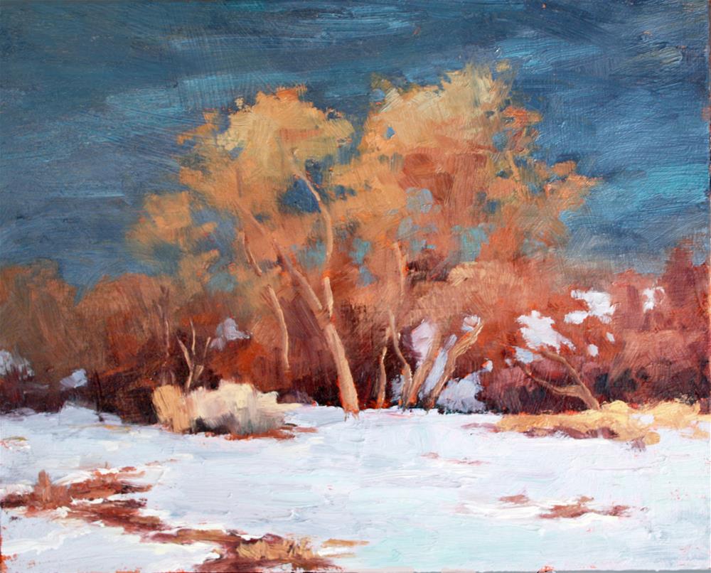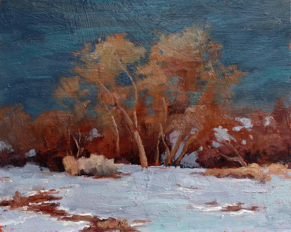 I was drawn by the strong contrast of the cottonwood against the dark sky of a stormthat had just passed. The scene was front lit so the tree glowed. I stayed with a limited palette of ultramarine blue, alizarin, yellow ochre and viridian. I used a canvas that I had prepped with a heavy coat of orange paint. I had purposely left randomly placed strong brushstrokes. Included is a pic where the colors are pretty darn close to the painting but you can't see those heavy brushstrokes. The second pic the brushstrokes can be seen but there' s quite a bit of glare and the colors, particularly the sky are too dark. @sheilamarieart I was drawn by the strong contrast of the cottonwood against the dark sky of a stormthat had just passed. The scene was front lit so the tree glowed. I stayed with a limited palette of ultramarine blue, alizarin, yellow ochre and viridian. I used a canvas that I had prepped with a heavy coat of orange paint. I had purposely left randomly placed strong brushstrokes. Included is a pic where the colors are pretty darn close to the painting but you can't see those heavy brushstrokes. The second pic the brushstrokes can be seen but there' s quite a bit of glare and the colors, particularly the sky are too dark. @sheilamarieart |