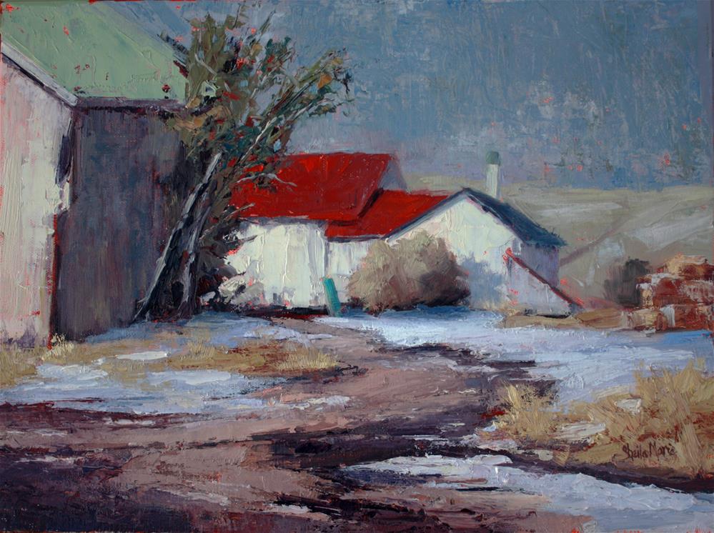 Driving down some back roads. This place caught my attention with that red roof and the muted green one in front. Bonus, that melting snow and muddy drive.