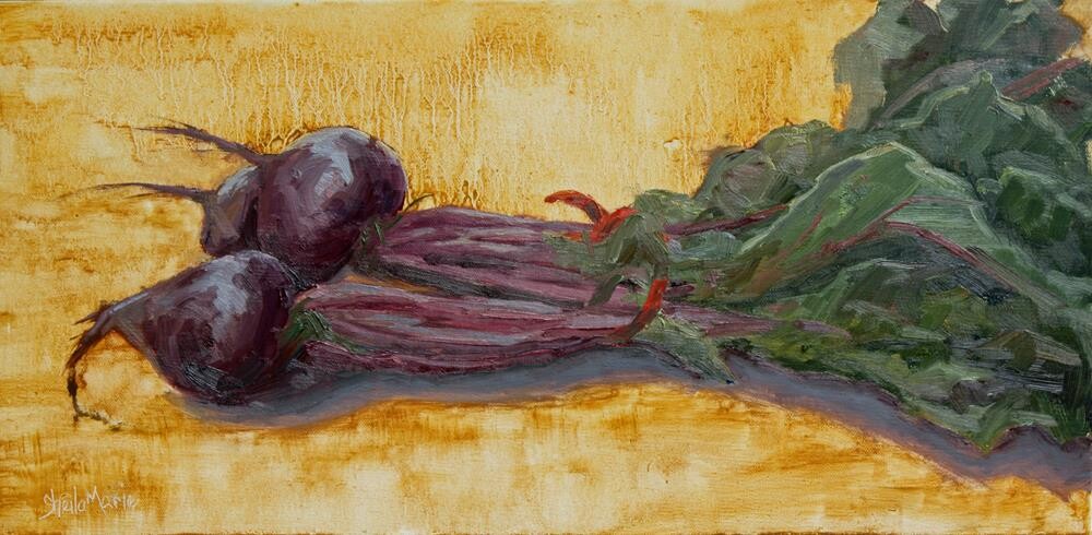 Finally, I had time to paint the same day the farmer's market was happening. Hard decision, radishes or beets, hmmm Well, the colors in these beets and the greens grabbed me.Set up on my deck and had a blast painting them. I'm not crazy about beets but sliced them up thin a little olive oil and salt and bake them until they were crispy. Not bad. Violet loves them for snacks. The greens got chopped up and Violet and I are still enjoying them. For me in salad and Vi has them on her kibble along with beef broth. She loves it!!@sheilamarieart