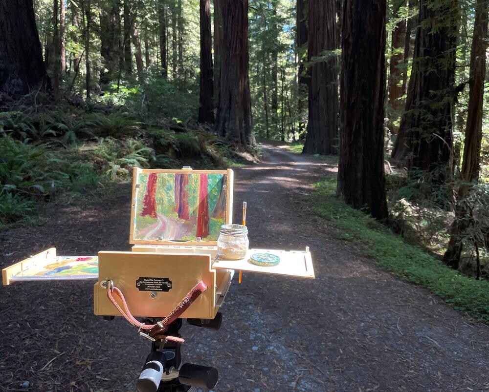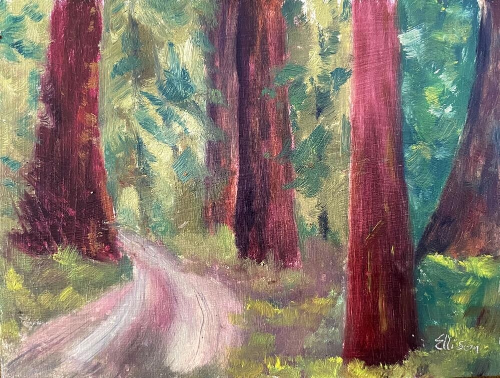 Painted on location in Humboldt Redwoods State Park, CA. We pulled off to the side of the road and I marched into the outback and found this old forest road. |
