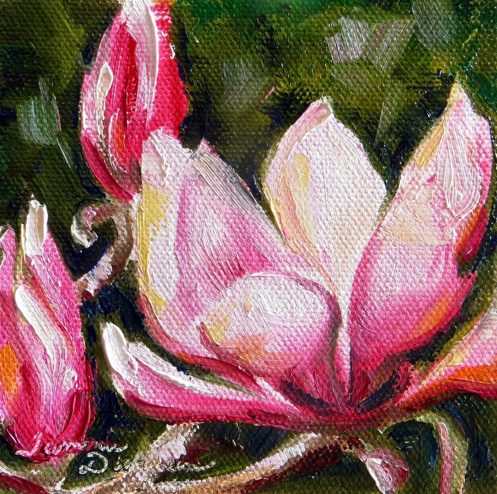 I love the grandeur of open pink magnolia blooms! They are majestic as they grace our tree each spring! Painting them today with brush and knife with oils.