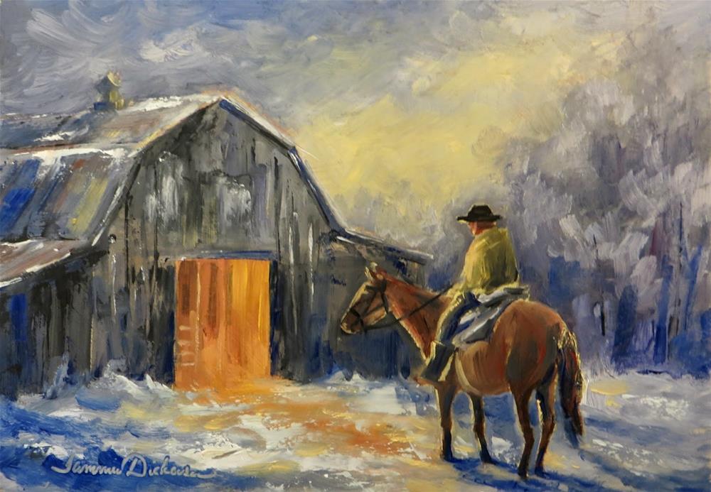 The day nearly gone, this rider gets back to the barn, where a warm light is waiting on this snowy day. Painted in oils with brush and palette knife.