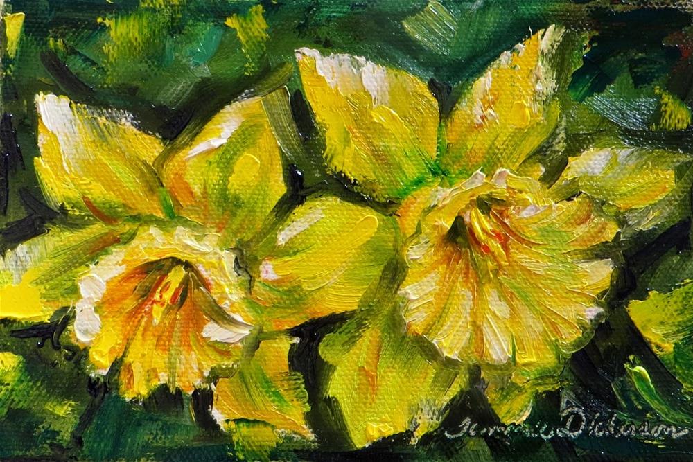 Cheerful, sunny daffodils greeted me from the garden today! Spring is really here when they show their happy faces! I am painting these with palette knife on unstretched canvas for today.