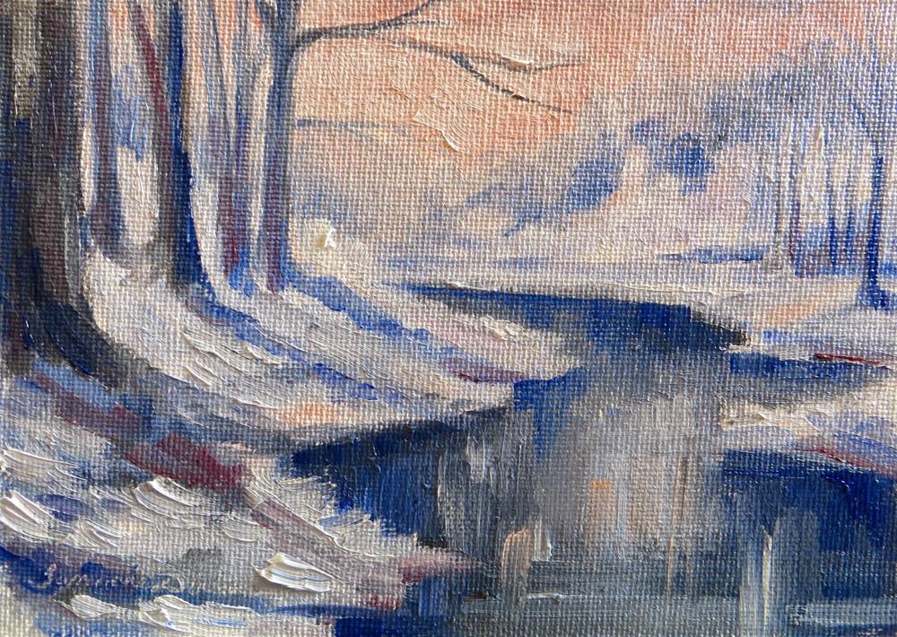 The calm, winter landscape is so peaceful by the water. Looking for tranquility on this hectic winter day with oils on canvas.