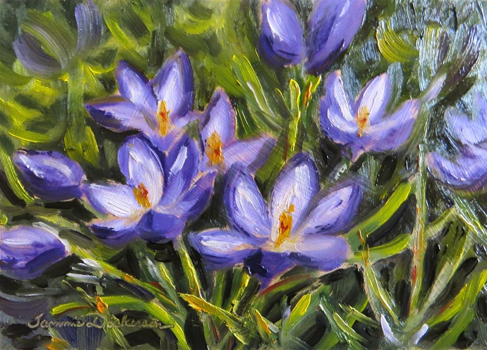These little beauties greeted me from the front garden today - and I had to capture them with paint! The purple crocus are my very first blooms of the season - planted decades ago by my grandmother :)