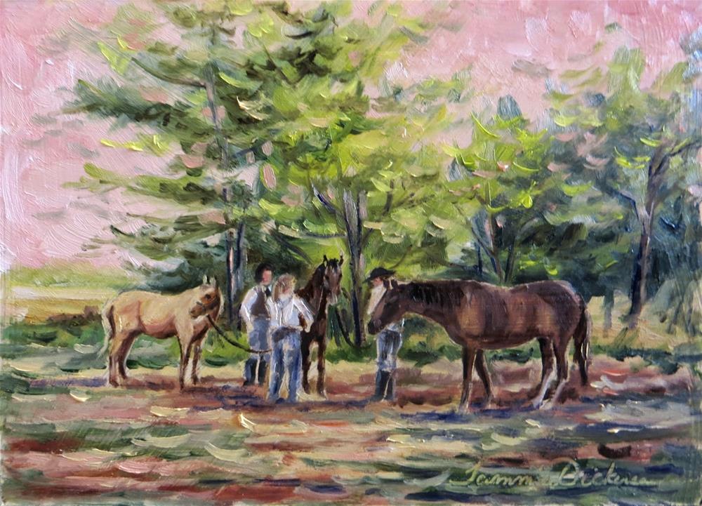 Painting in oils today, these three riders gather their horses to put them up, after a day of riding.