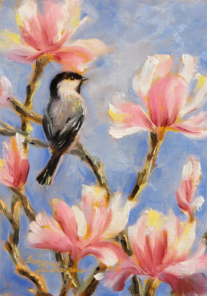 These glorious magnolia blooms are so regal as they open on the trees! The chickadees have been in and out of the branches all day as I capture them with brush and knife.