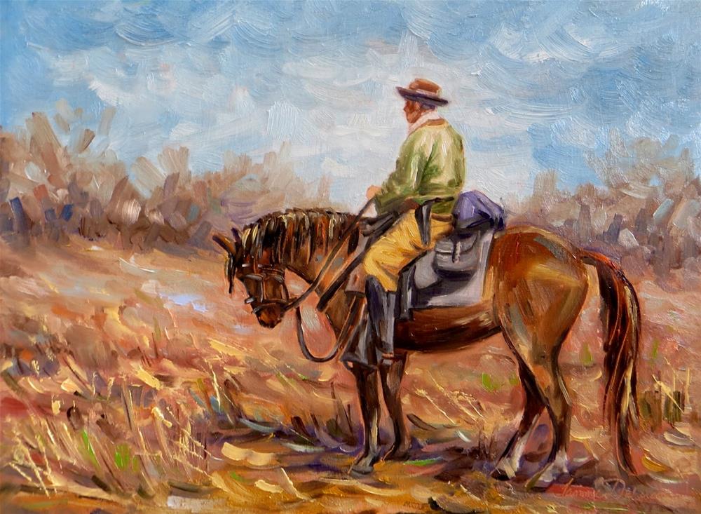 This gorgeous horse shines in the sun as horse and rider cross the pasture. Painted in oils with brush and palette knife.