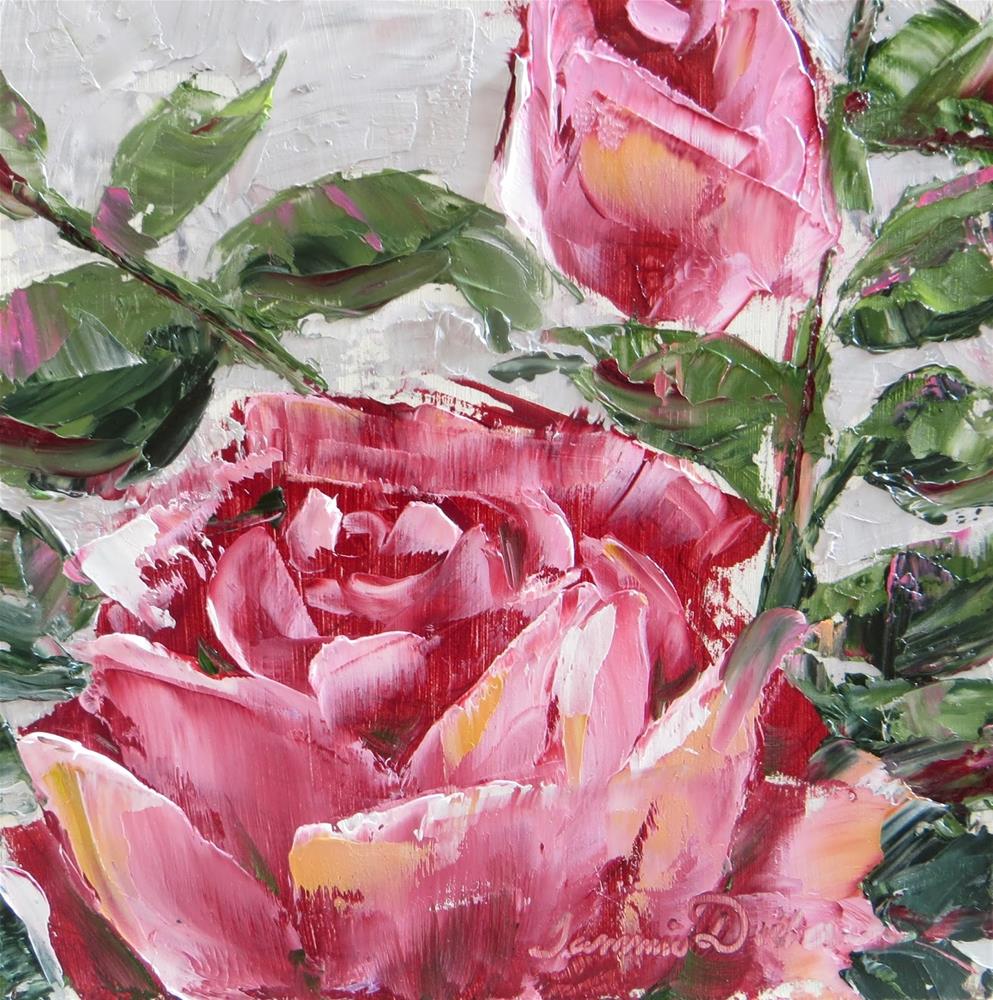 These beautiful pink roses have been completely painted with palette knives, capturing the flow of each petal inthe process.