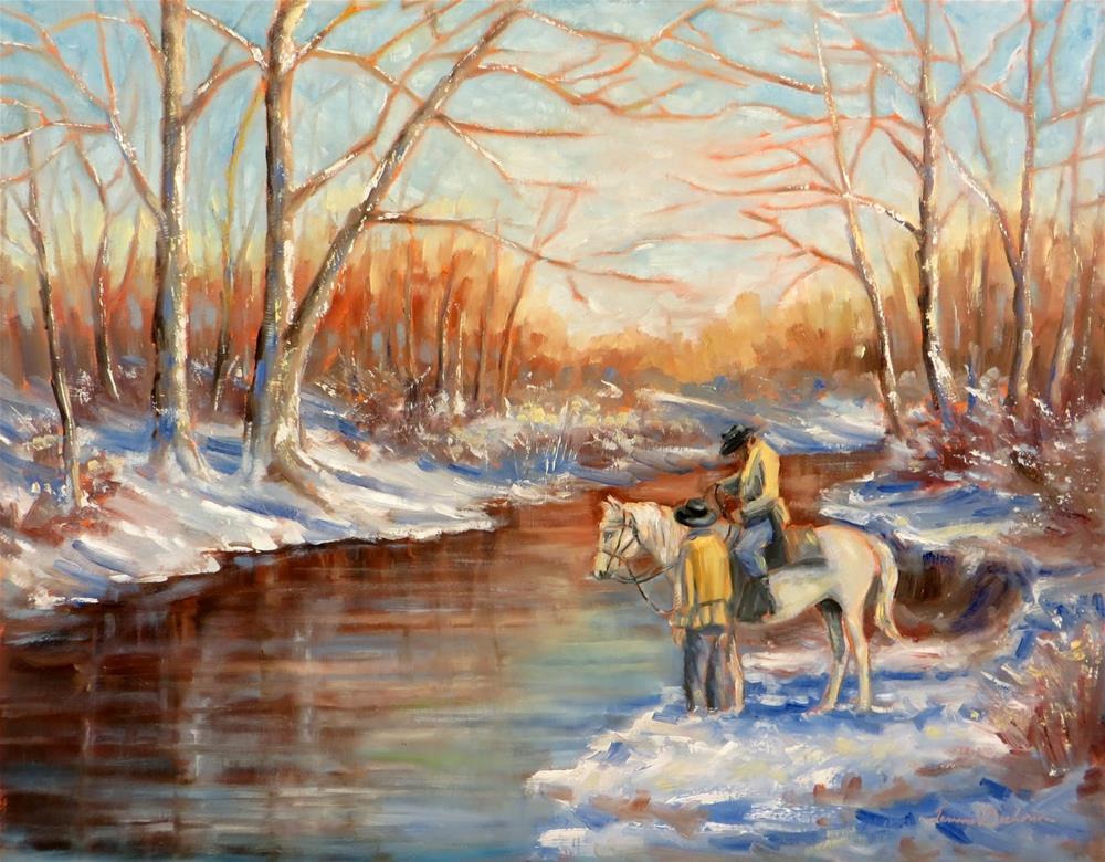 This creek on the Kansas side rambles gently through woods and park land alike. Capturing the winter color today with palette knife and brush.