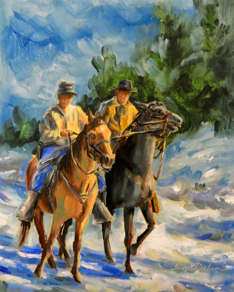 Using brush and palette knife, I have captured these two on a winter's ride through the snow.