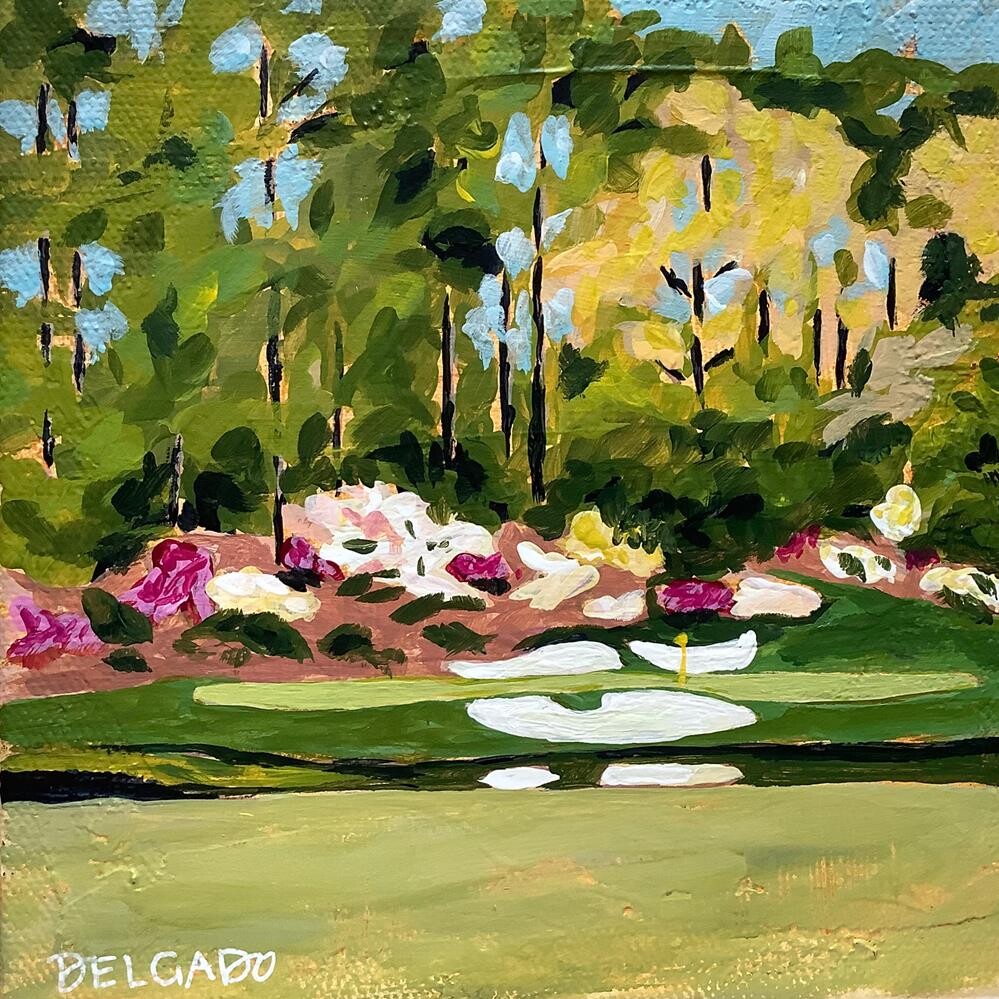 Please Note: Colors and brightness of art pieces can vary slightly in-person from how they appear on individual computer screens, depending on your monitor settings. Copyright © 2025 Theresa Delgado. All Rights Reserved. "Augusta National Golf Club Hole 12" AKA Golden Bell Step into the serene beauty of "Golden Bell," the iconic 12th hole at Augusta National. This painting captures the delicate dance of light and shadow across the meticulously manicured green, framed by the vibrant hues of azaleas and the towering trees that whisper tales of Masters tournaments past. You can almost feel the gentle breeze that often swirls through this legendary short par-3, a deceptive beauty that has challenged the greatest golfers. Did you know that the Hogan Bridge, which crosses Rae's Creek to the 12th green, was dedicated in 1958 to commemorate Ben Hogan's then-record-tying score of 274 in the 1953 Masters? This painting invites you to pause and appreciate not only the visual splendor but also the rich history embedded in this hallowed ground. Perfect for bringing a touch of Augusta's timeless elegance and golfing lore into your home. Details of the Artwork: