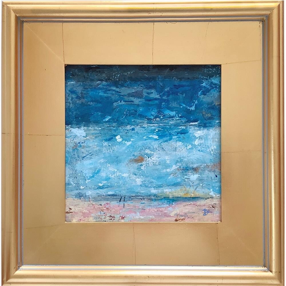 • Artwork is 8x8", measures 14x14" in gold leaf frame • Initialed in the front, signed in the back • Buyer will receive this painting safely packaged and ready to hang. Please allow 5-7 business days to ship.