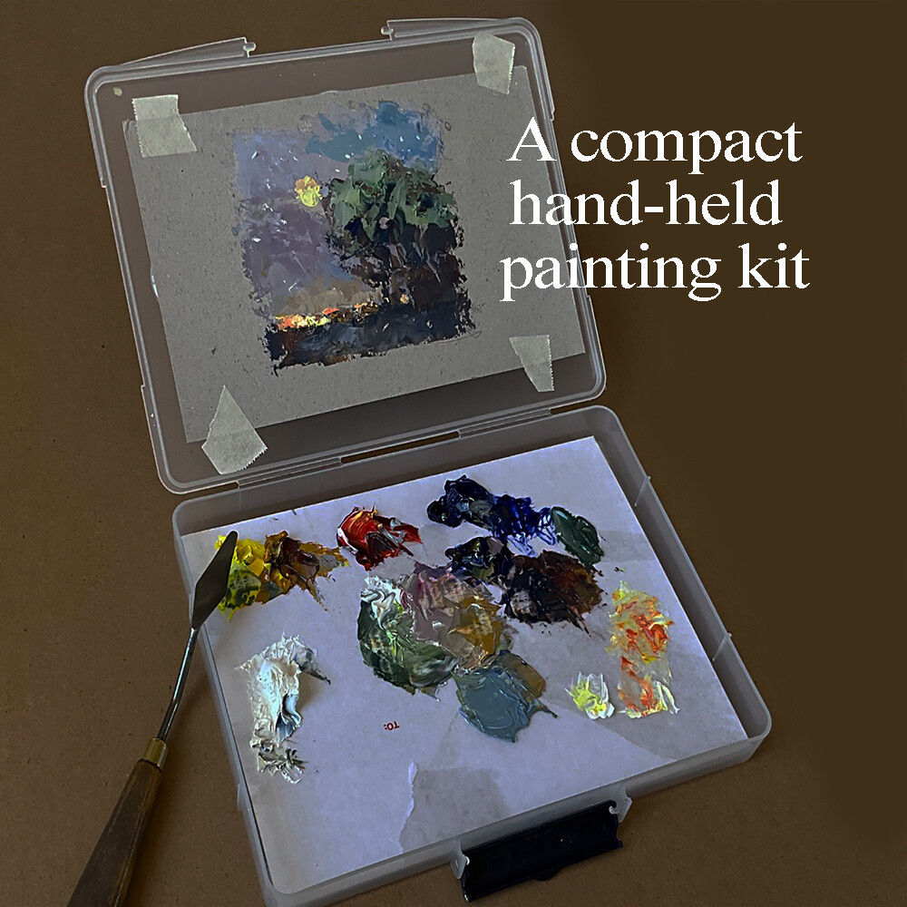 The current full moon was too much to resist. I wanted to capture it as simply as possible, so I used a shallow plastic box with a pre-loaded palette in the base and my panel taped inside the lid. When I got to the spot at the edge of a nearby farm I opened the lid and I was ready to paint. The entire painting was done with a knife. No brushes to clean and no solvents to spill. When I finished I simply closed the lid with the painting stored safely inside. This is an oil painting on repurposed cardboard. The painted area is approximately 4x4 inches, and the cardboard panel is 8x5 inches. (ww3770) The current full moon was too much to resist. I wanted to capture it as simply as possible, so I used a shallow plastic box with a pre-loaded palette in the base and my panel taped inside the lid. When I got to the spot at the edge of a nearby farm I opened the lid and I was ready to paint. The entire painting was done with a knife. No brushes to clean and no solvents to spill. When I finished I simply closed the lid with the painting stored safely inside. This is an oil painting on repurposed cardboard. The painted area is approximately 4x4 inches, and the cardboard panel is 8x5 inches. (ww3770) |
