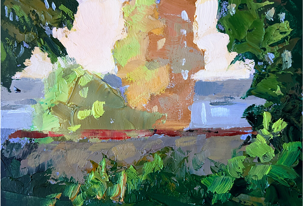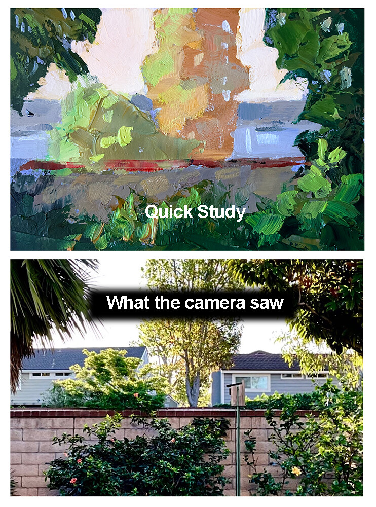 This is a very quick study of the morning light, looking over a wall toward another neighborhood. It's a small oil study measuring about 3x4 inches, painted on paper. I also shot a photo for comparison with my art, where you can easily see where I took artistic license. This is a very quick study of the morning light, looking over a wall toward another neighborhood. It's a small oil study measuring about 3x4 inches, painted on paper. I also shot a photo for comparison with my art, where you can easily see where I took artistic license. |