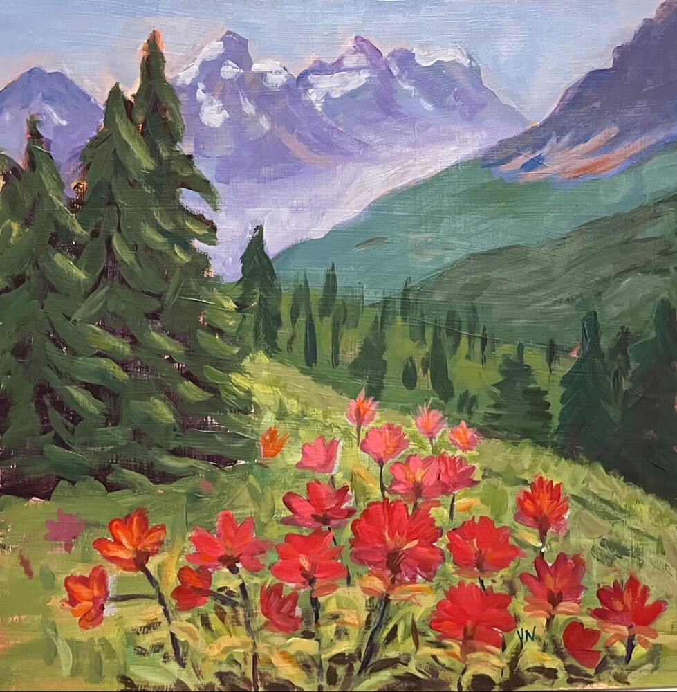 Flower season in the Alberta alpine. (Completed in class with Brian Buckrell, part of the Paint Canada series from Acrylic University. Photo: Brian Buckrell.) The painting is protected with satin acrylic varnish which also enhances colour. It will be carefully packaged and sent with tracking.