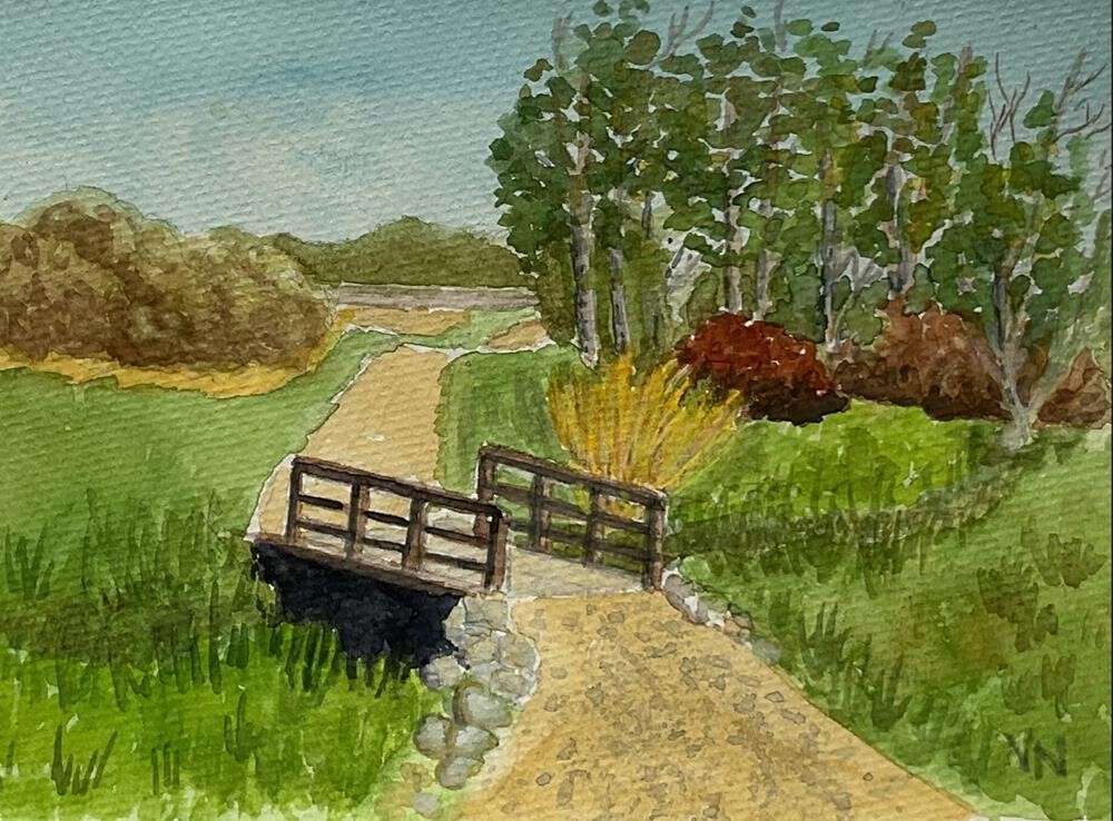 Your painting will be carefully packaged and sent with tracking. A foot bridge on one of our local walking paths. I was attracted to the shrubbery—full of color even before the leaves appeared.