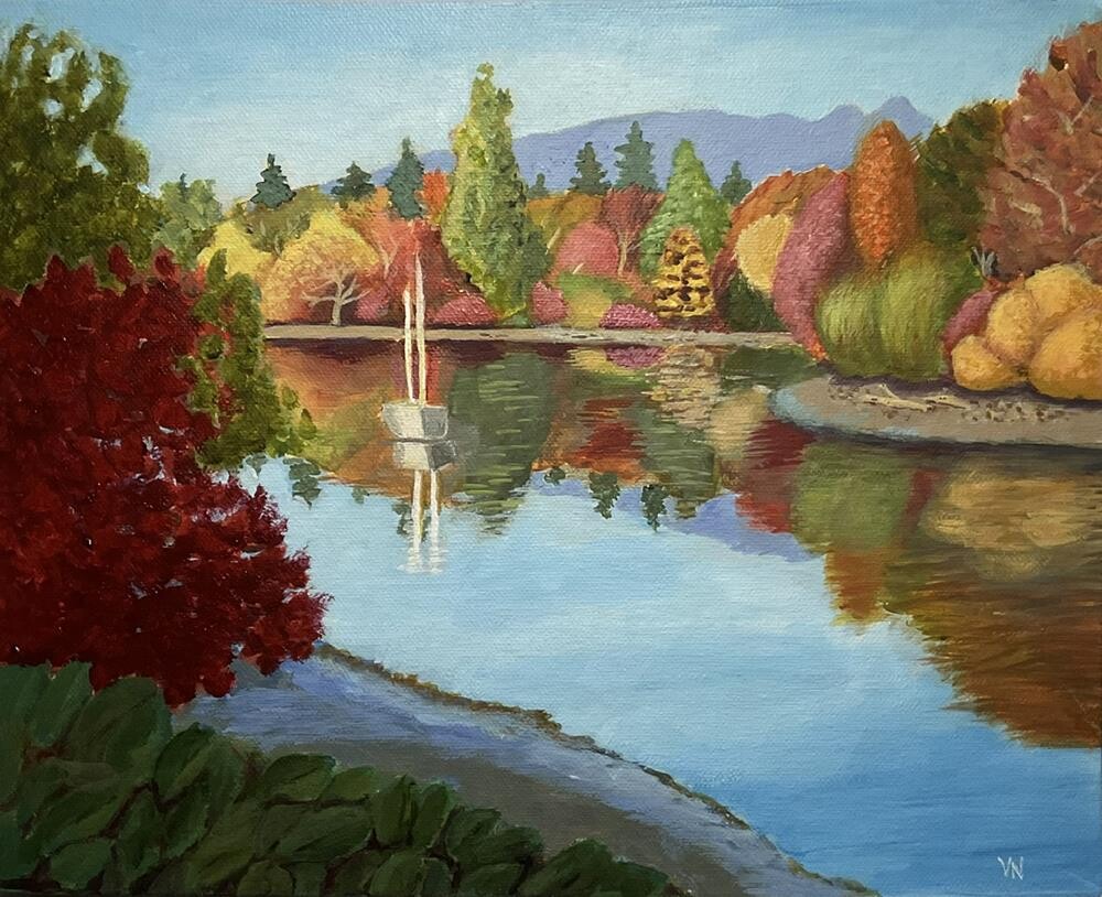 The local Fort to Fort walking trail follows the Bedford Channel of the Fraser River. I have walked it in all seasons, and it is especially pretty in fall. I tried to capture some of that beauty in this painting. The painting is protected with a satin varnish. It comes unframed and will be carefully packaged and sent with tracking.