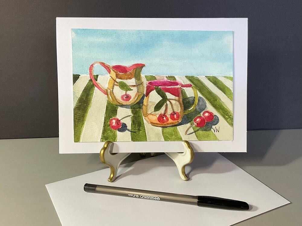 Your 4 x 6 inch original painting is mounted on a 5x7 inch card. Card & envelope are packaged in a protective cellophane sleeve.