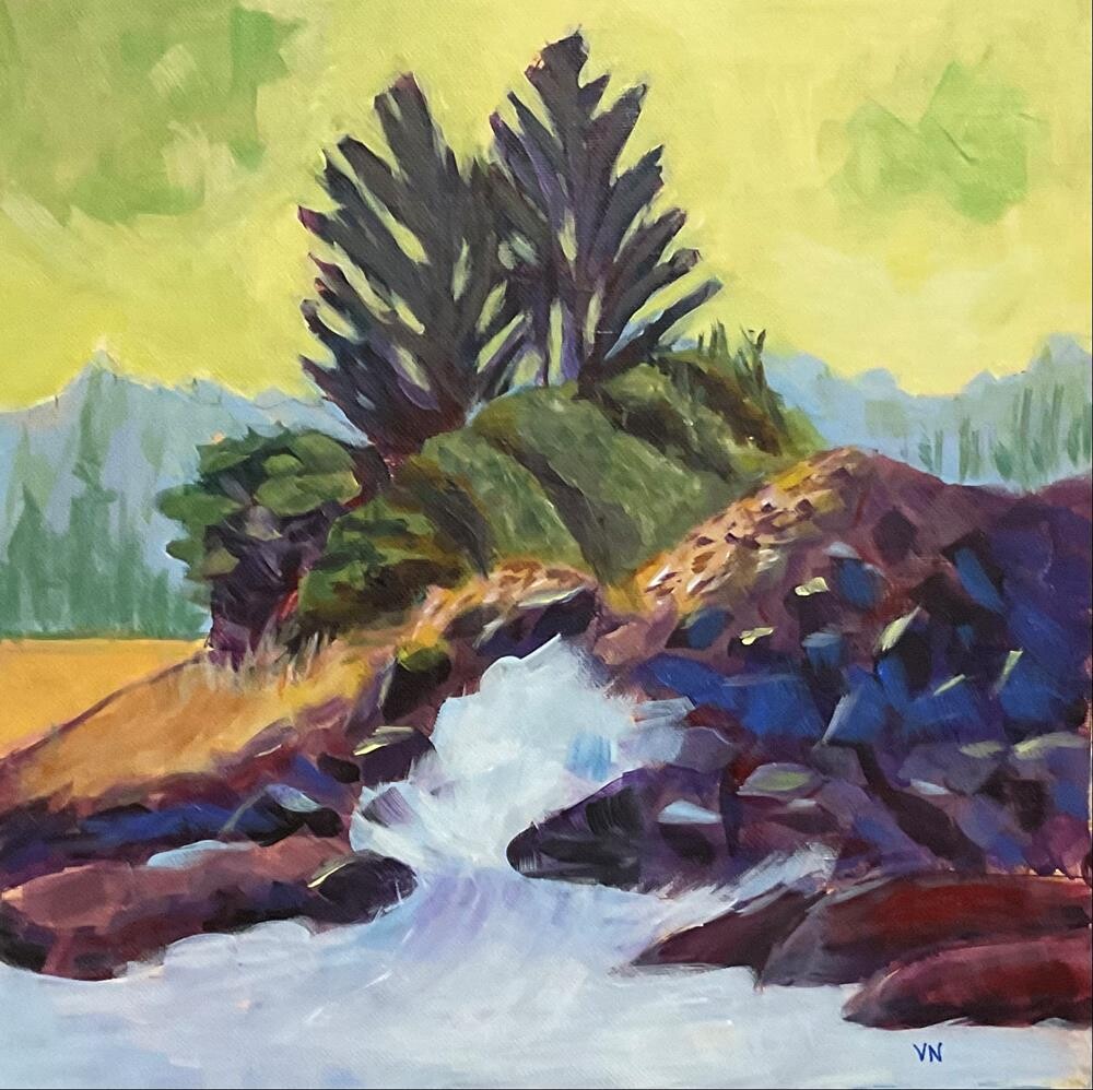 “Chesterman Beach” is near the Vancouver Island town of Tofino. Painting this had me yearning to experience again the big sky and the crashing spray of Vancouver Island’s west coast. (Completed in class with Brian Buckrell as part of the Paint Canada series from Acrylic University). Photo: Brian / Cathy Buckrell