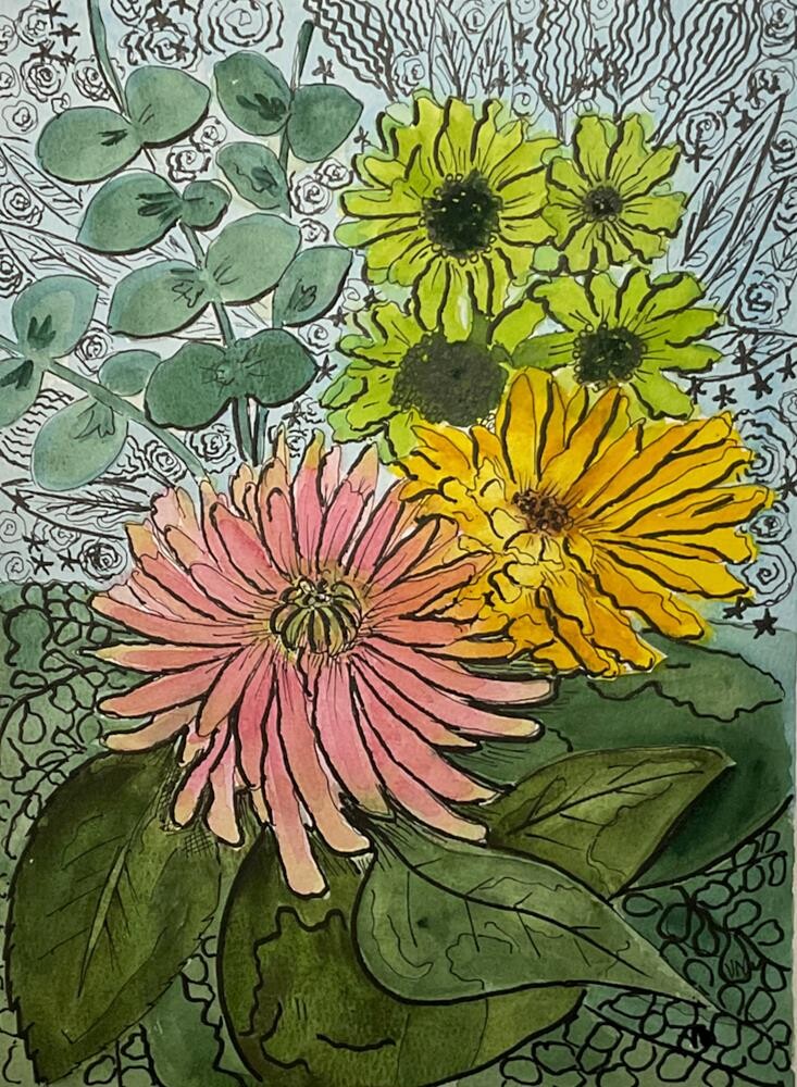 I Had a lot of fun, trying out my new bent nib fountain pen on this watercolor & pen painting.