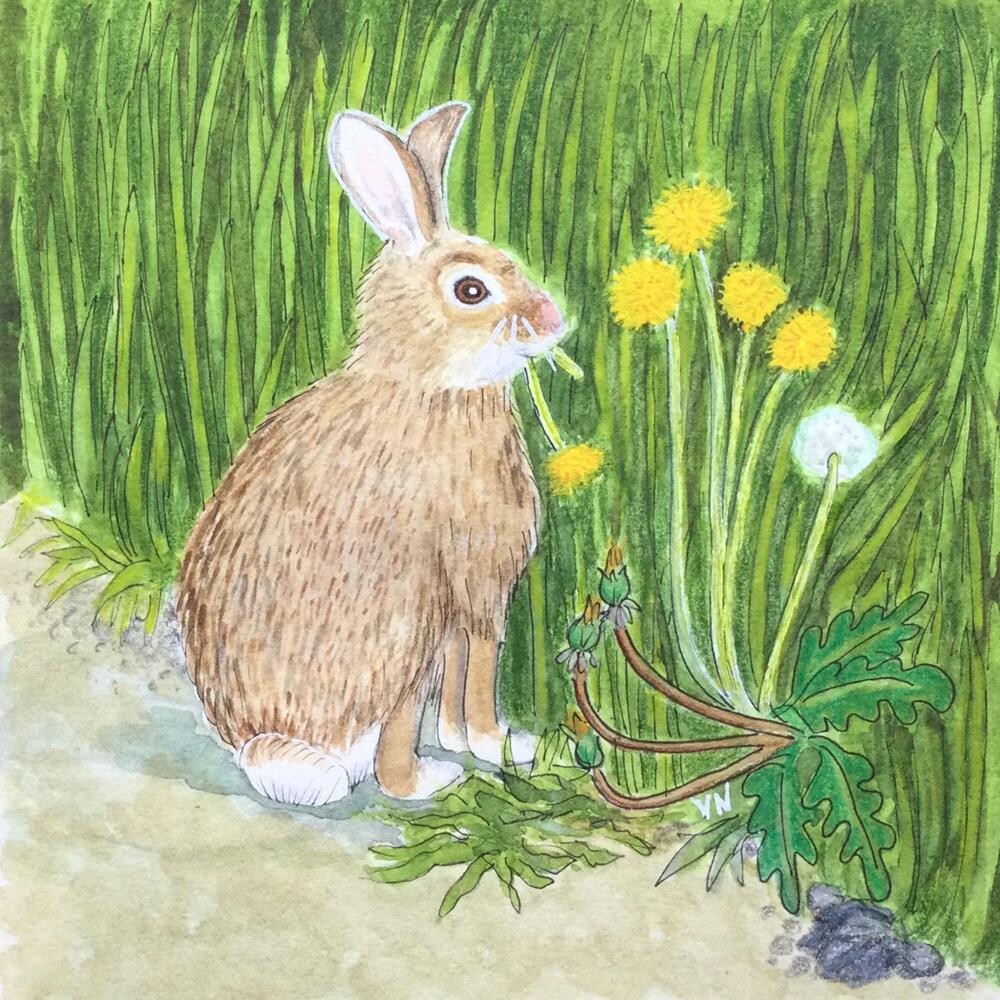 Wild rabbits are a common sight on our daily walks. I suspect they have quite a rabbit city developed in the tall grasses and shrubs that border our riverside trail. I like to imagine life in their holes and burrows (in the spirit of a favourite childhood author of mine, Thornton W. Burgess; books by Thornton W. Burgess). “Rabbit Salad” is unframed. It will be carefully packaged and mailed with a tracking number. Wild rabbits are a common sight on our daily walks. I suspect they have quite a rabbit city developed in the tall grasses and shrubs that border our riverside trail. I like to imagine life in their holes and burrows (in the spirit of a favourite childhood author of mine, Thornton W. Burgess; books by Thornton W. Burgess). “Rabbit Salad” is unframed. It will be carefully packaged and mailed with a tracking number. |
