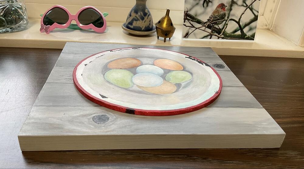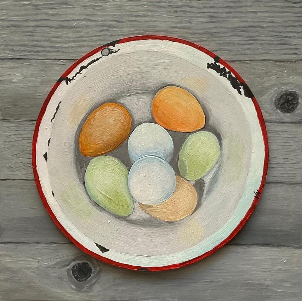 I grew up on a farm where gathering eggs was always someone’s chore. Chipped enamel bowls were also a familiar part of farm life. So this is a painting from my heart. The piece is made up of two—the bowl of eggs painted on a round panel, mounted onto a 10 x 10 inch cradled wood panel, painted the colour of old barn wood.