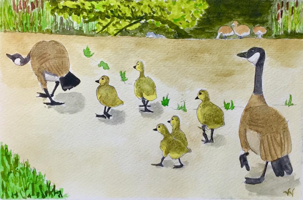 These Canada Geese are out on a family stroll. The goslings are well protected by a hissing parent in the lead and another watchfully bringing up the rear.