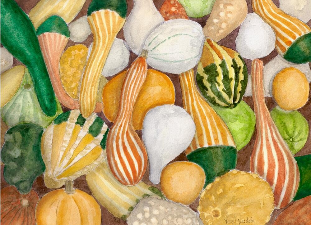 “Gourds” is sold unframed. It will be carefully packaged and sent with tracking.