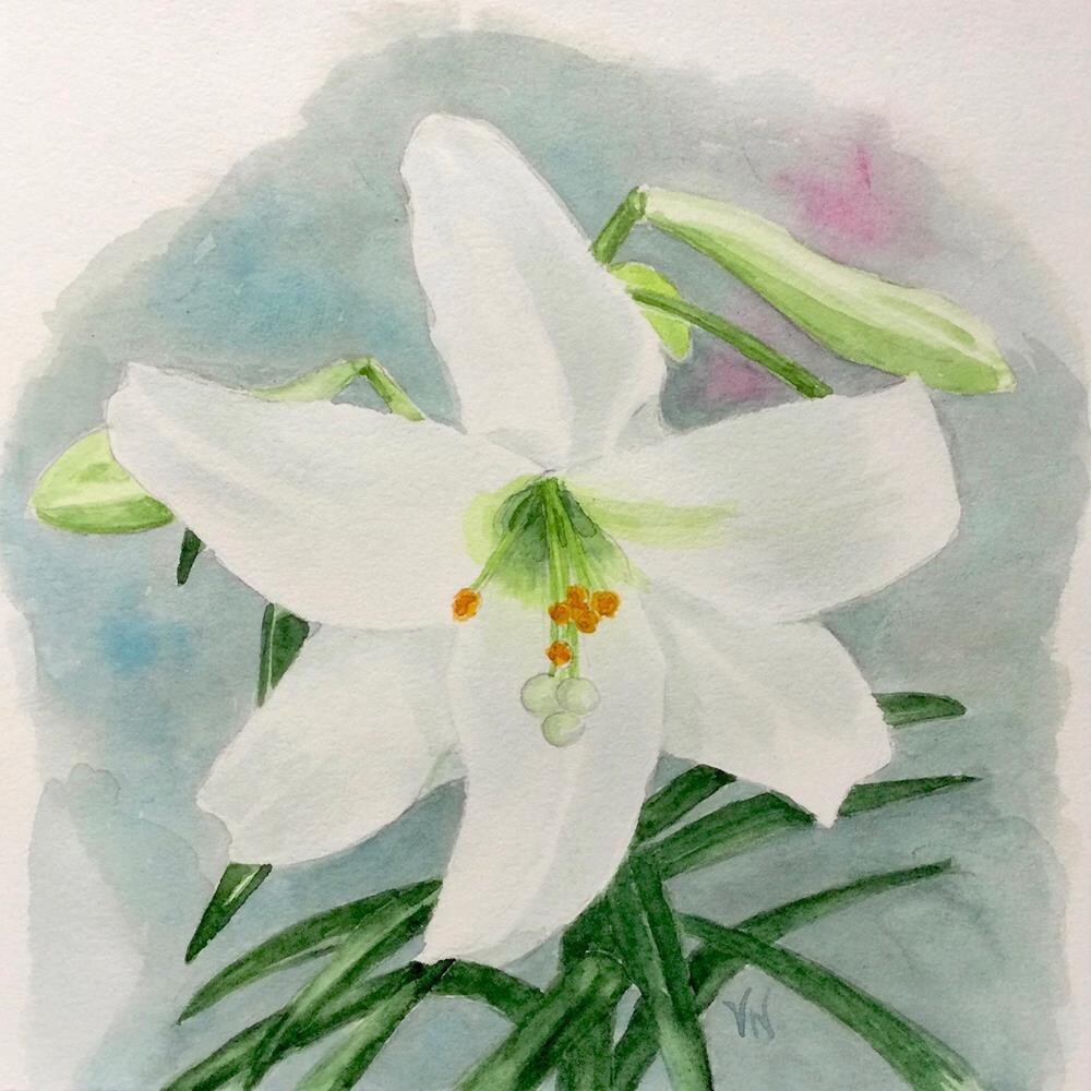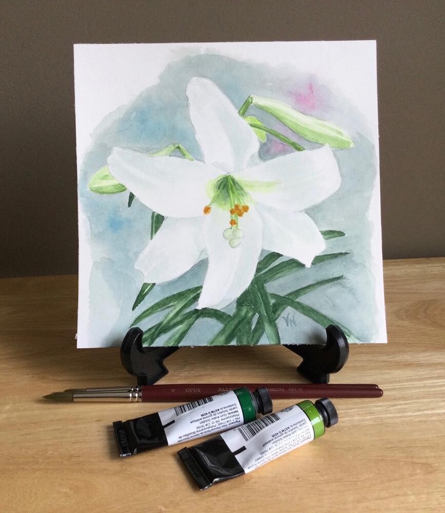 Originally painted as part of a project for Lent, this white lily, also sometimes called Easter Lily, is an icon of purity, spring, and new life. “Joy—White Lily” is a 7x7 inch original watercolor painting of a single open lily and several buds. It is painted on140 lb., 100% cotton, hot press watercolor paper. Painting is initialed on the front, titled, dated, and signed on the back.It is not matted and comes unframed. It will be carefully packaged and mailed via Canada Post with a tracking number.