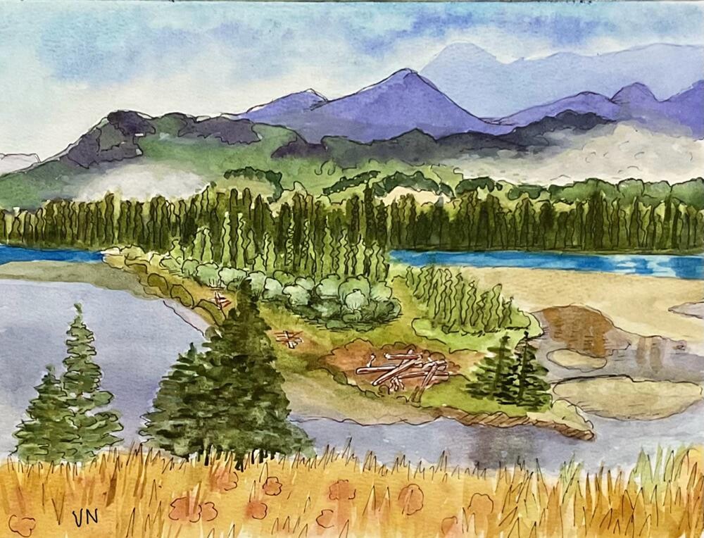 I have documented our travels through the Rocky Mountains of Alberta & BC with lots of photos. This painting is inspired by a couple I took at a road stop on a crisp August morning in 2013. I’m hoping to do a larger acrylic painting of the same scene one day soon. Your unframed painting will be carefully packaged and sent with tracking.