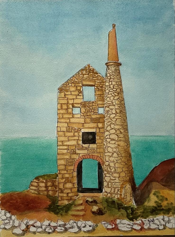 The old mine works that dot the Yorkshire coast bring to mind the Poldark TV series. Rendered in pen and watercolor on 140 lb. watercolour paper, the painting is unframed. It will be carefully packaged and sent with tracking. (Reference photo from Pixabay.)