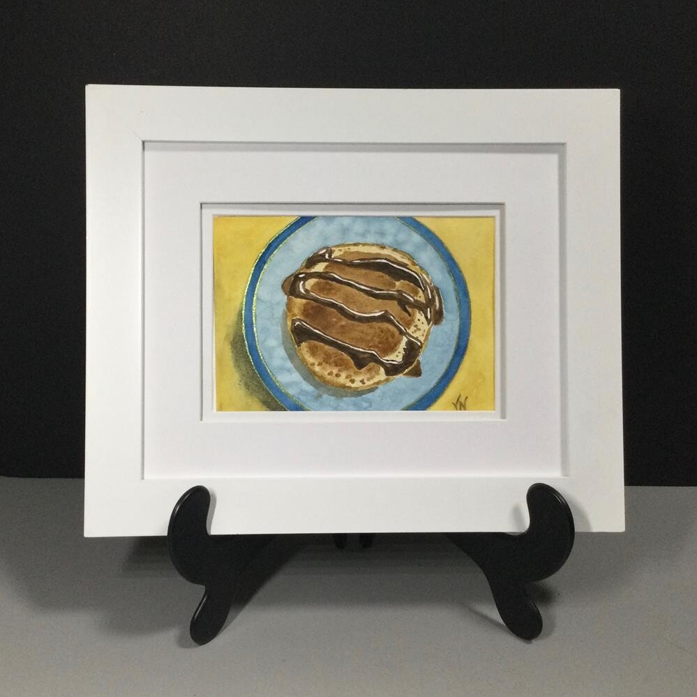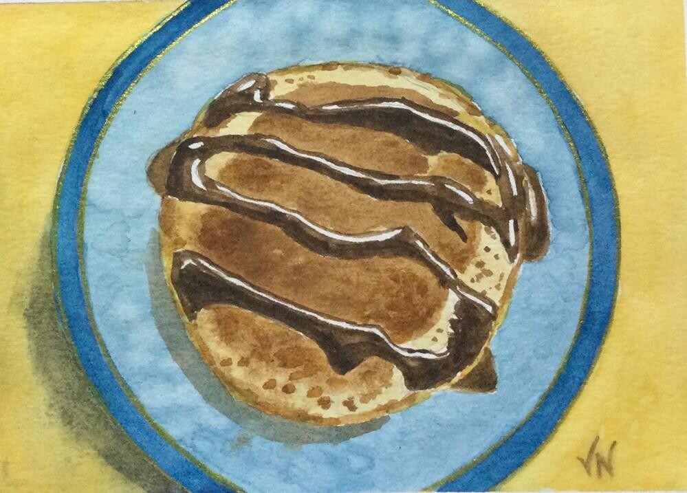 Original mixed media painting of pancakes with chocolate syrup on watercolor card stock.