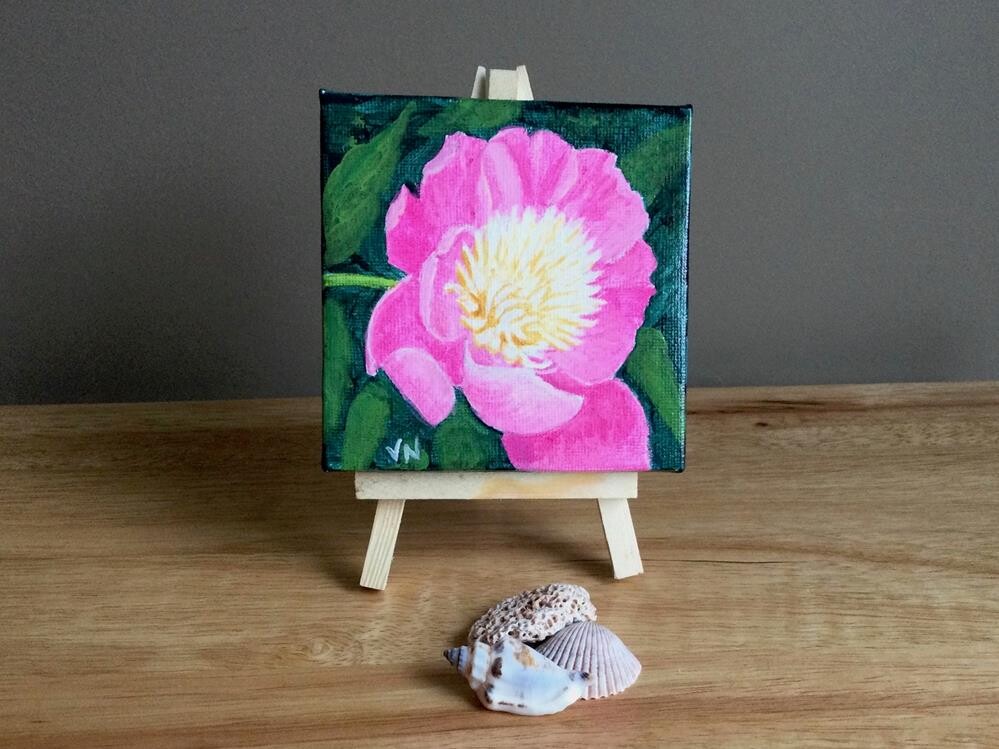 This tiny rendition of one of the garden’s most painted blooms would make a great addition to a shelf, ledge, or tabletop in a cottage or tiny house. Or purchase it as a gift. The 4 x 4 x .5 inch painting on stretched canvas comes with its own easel for display.