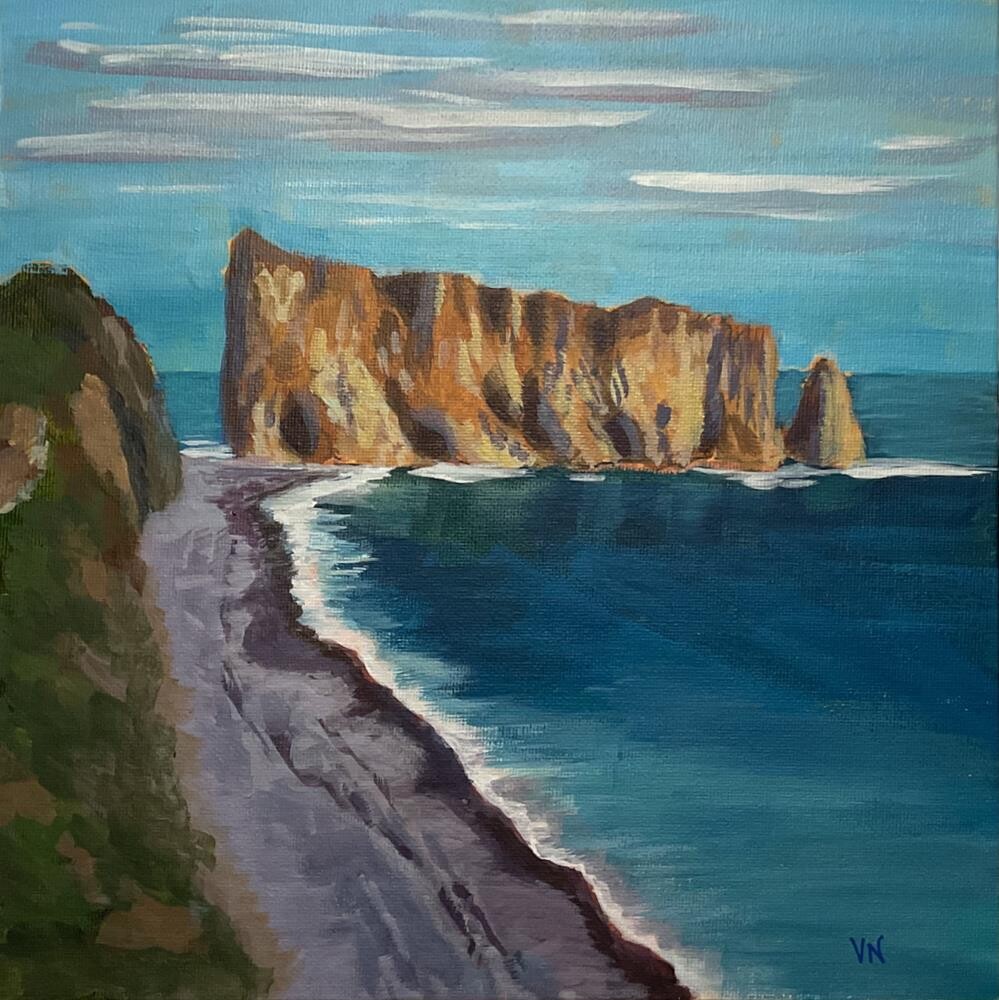 I was thrilled when my son, who visited Quebec on his vacation this summer, recognized this as Percé Rock without my telling him (as I have not seen it in person). A photo by Brian / Cathy Buckrell inspired this painting, which was created in class with Brian Buckrell. It is part of the Paint Canada Challenge from Acrylic University. To discover more about the painting and how it can be yours, contact artist. (Note that this item may be subject to tariffs when shipping to the USA.)