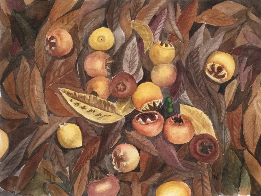 Every fall I am struck by the beauty I find under a local tree—fallen persimmons nestled in their bed of rust, brown and gold leaves. “Persimmon Fall” is my attempt to capture this rich tapestry of autumn.