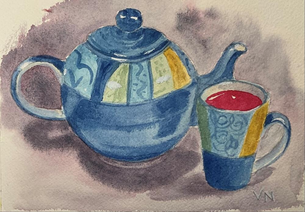Your painting will be carefully packaged and sent with tracking. A favourite teapot and mug posed for this life painting.