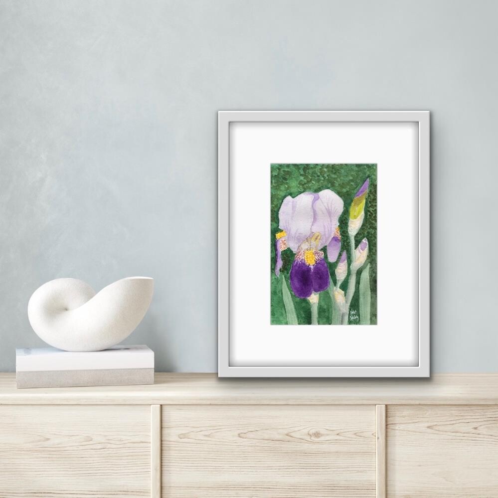 This 10 x 6.5 inch watercolor painting is on 140 lb. watercolor paper. It comes without a mat and is unframed. Shipping is by Canada Post with a tracking number These showy mauve and purple bearded irises bloom every year on our street. If only they lasted longer than a few days in June.