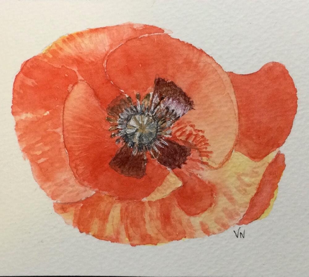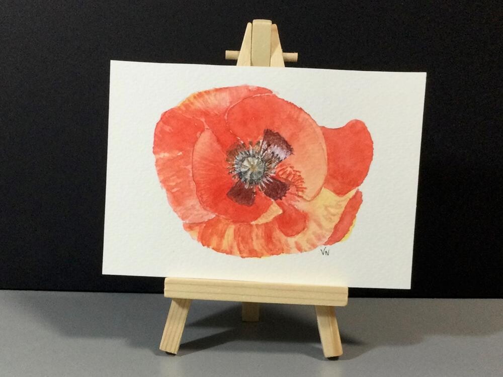 Tiny watercolor painting of a single poppy on 140 lb. 100% cotton watercolor paper.